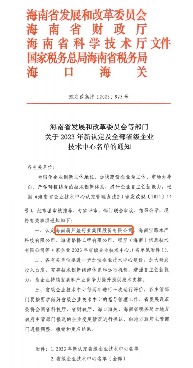 近日,海南省发改委等多部门联合公布了《关于2023年新认定及全部省级企业技术中心名单的通知》,其中,海南918博天堂药业集团股份有限公司成功通过评审,被认定为省级企业技术中心,是本次获批的4家企业之一。